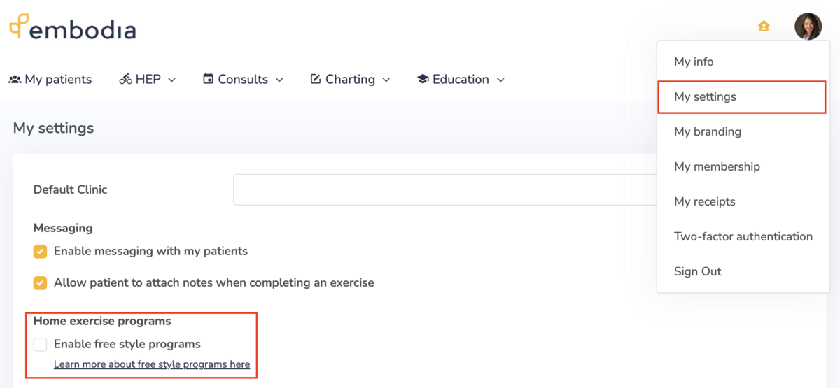 To be able to prescribe free style programs, you first need to enable them on your account. To do so, click on the Settings tab in the top nav bar, and then on My settings under the My account section. Check the Enable free style programs checkbox and then click on Update my settings.